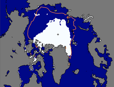 The following map and excerpt from a Science News article titled, “Arctic sea ice hits record low and keeps going,” reveals the present status of the Arctic ice cap. The average ice coverage for the 21 years between 1979 and 2000 is demarked by the orange line that can be seen running from the Greenland Sea, west and north of Svalbard, through the Laptev Sea to Russia’s Wrangel Island and through the Beaufort Sea to the Canadian Archipelago. The difference between that area and the area presently covered by ice is at best, shocking. …