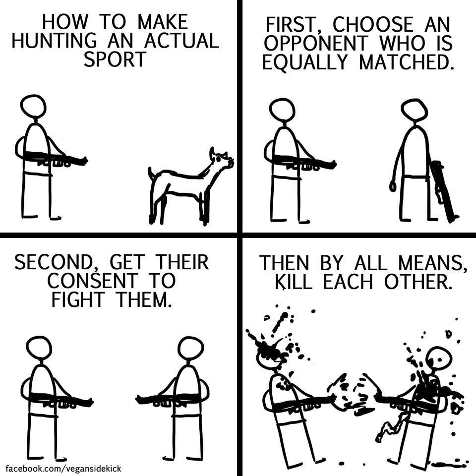 Yes! Unfortunately, we know that the populations of these poor animals really must be in trouble, for a government to initiate such a ban. I would love to see a Real Sport as the cartoon illustrates: “Hunt each other, leave the animals alone!”