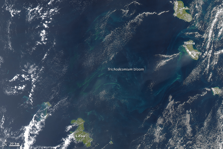(A Trichodesmium bloom off New Caledonia. Image source: Earth Observatory.)