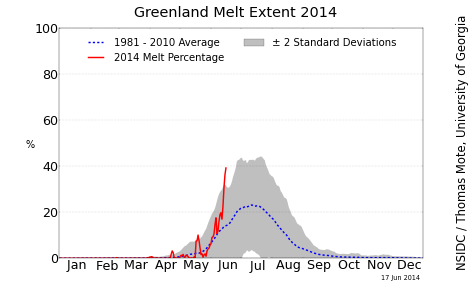 (Greenland Melt Extent as of June 17, 2014. Image source: NSIDC.)