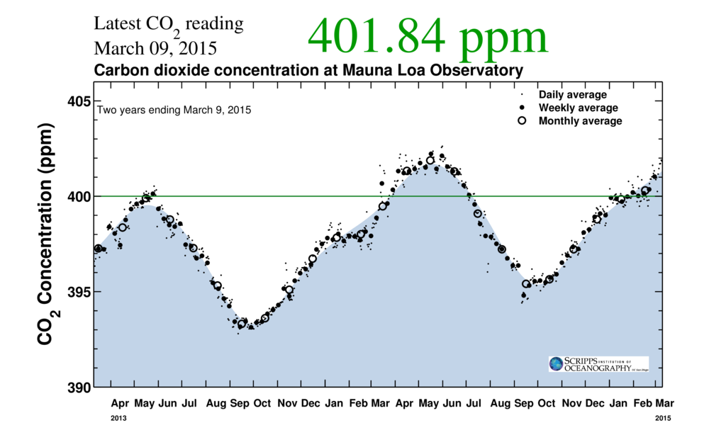 (CO2 hit above 401.84 parts per million on March 9, 2015, and above 403 parts per million on March 10 — levels that test the upper boundary of CO2 last seen during the Pliocene and entering a range more similar to the Miocene. Image source: The Keeling Curve.)