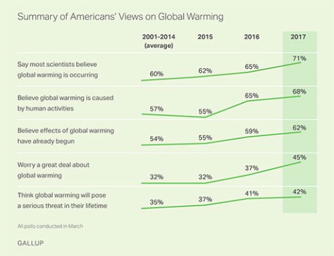 (Harmful impacts to Americans from climate change are on the rise and the number of Americans concerned about climate change has never been higher. Image source: Gallup.)