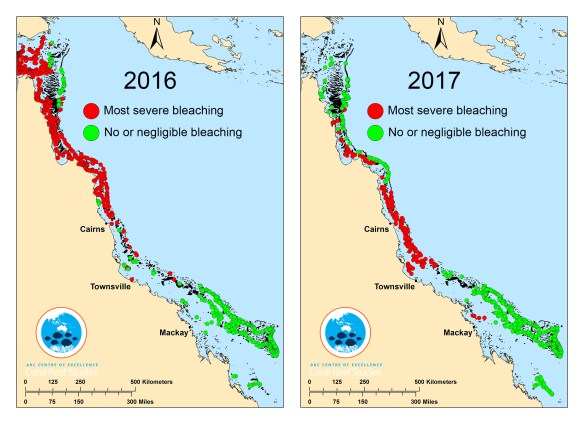 (New composite bleaching maps show the extent of the 2016-2017 coral mortality event which now…