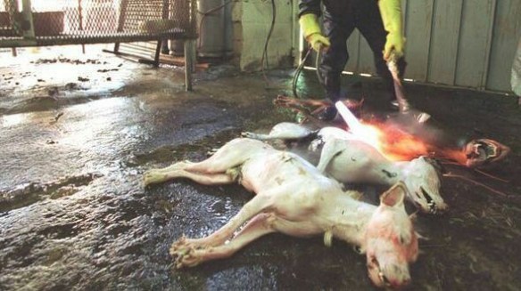 Very interesting and symbolic juxtaposition–human beings causing suffering and death in order to eat the unfottunate dogs they own/control, while a company makes money producing food for other, more fortunate, dogs owned as pets.