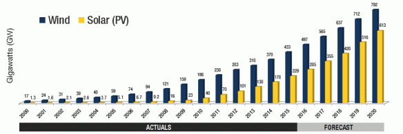 (Historic and projected global wind and solar capacity. Image source: Forecast International.)