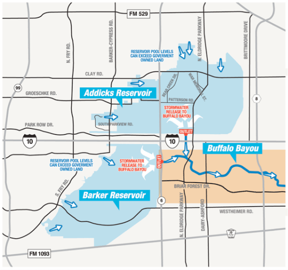 (Addicks and Barker Reservoirs spill into Buffalo Bayou, which then flows into downtown Houston. Earlier today controlled releases were begun in an attempt to slow water rise in the reservoirs. This release is failing to prevent rapid water rise within and around these reservoirs. Movement of flood waters into the reservoirs is pushing waters into subdivisions near the reservoirs even as risk of levee failure is rising. Image source: