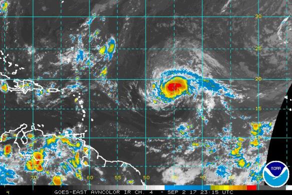 As of the 5 PM Atlantic Standard Time statement from the National Hurricane Center, Irma was positioned about 1,100 miles east of the Leeward Islands in the central tropical Atlantic. The storm hosted a small circulation, packing 110 mph winds and a minimum central pressure of 973 mb. Over the next few days, according to the Hurricane Center, Irma is presently expected to reach major hurricane status with 130 mph maximum sustained winds.