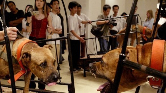The guggenheim is showing a video of this, not hooking up actual dogs. But this is bad enough….