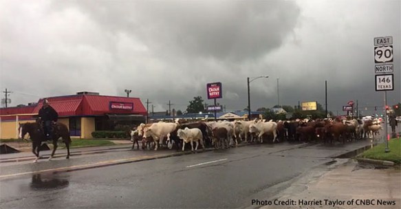 A cowboy leads “rescued” animals down a city street after hurricane Harvey hits Texas.