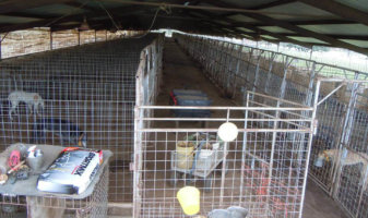With few exceptions, the greyhounds are solitarily confined in unsanitary dirt-floored wire cages devoid of any form of enrichment.