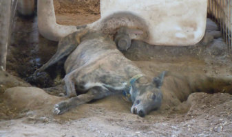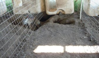 Imprisoned in an old turkey shed are approximately 150 perpetually penned greyhounds—many already used, abused, and discarded by the notorious dog racing industry—who neurotically spin in circles, jump up and down, cry out, and hide in the jagged old chemical tanks that serve as their only shelter.