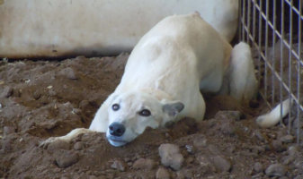 They are deprived of everything that is natural and meaningful to them, including exercise, companionship, and the opportunity to bond with a human family. Out of boredom and despair, they just dig and chew on the old filthy chemical tanks that serve as their shelter, leaving sharp and jagged edges that sometimes injure them. Some dogs pace, spin endlessly in circles, jump up and down, and cry out when approached. Others are so terrified that they cower and lose control of their bladder or bowels.
