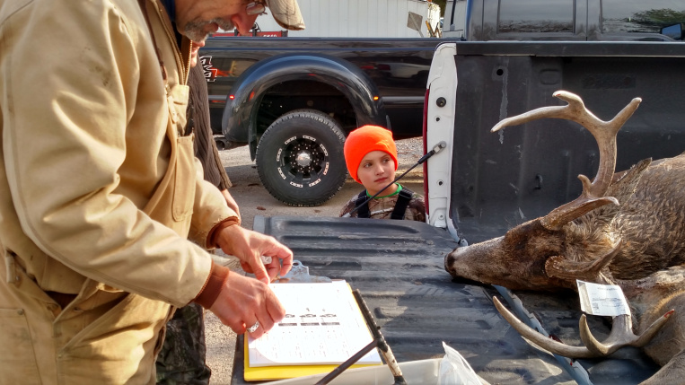 One advantage of having deer check-in stations in counties with chronic wasting disease is the ability for Illinois Department of Natural Resources staff to answer questions of natural curiosity, such as Joey Patyk watching fisheries biologist Rob Miller work on a buck at the LaSalle County check station in 2015.