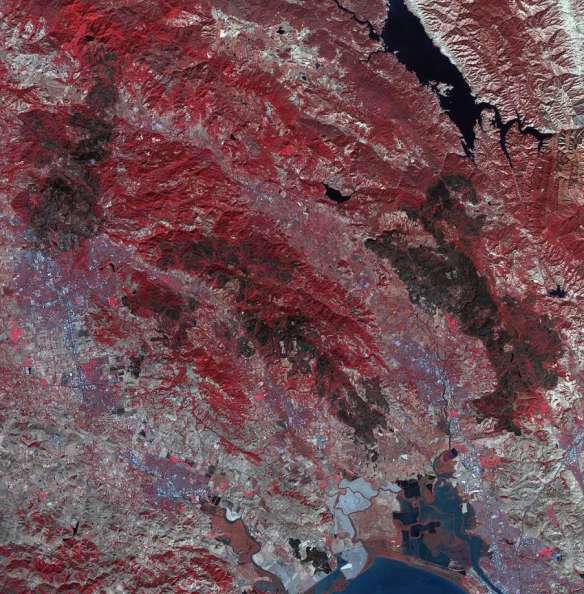(A satellite image of the burn scar left following the North Bay fires. Human-caused climate change is a primary enabler for these kinds of disasters. Image source: NASA.)