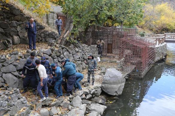 This week, they’re celebrating the successful rescue of the first two bears, Dasha, a female, and Misha, a male, who were being kept in a small cage that was half-submerged in water by a riverside restaurant in Yerevan.