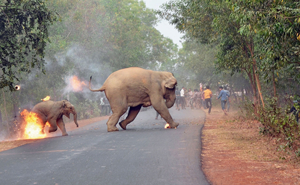 A baby elephant was severely burnt and terrorized,after it was struck with a flaming bar of tar in the East Indian state of West Bengal. Award-winning photographer Biplab Hazra captures the exact moment the mob of” jeering men”threw the balls of tar and firecrackers at the calf.