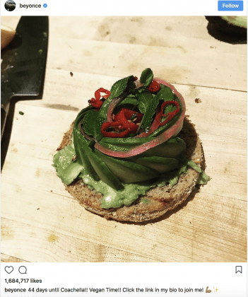 In preparation for her much-anticipated return performance at this year’s Coachella music festival in April, the 22-time Grammy winner shared her training regime by posting a mouth-watering photo of avocado toast with the caption, “44 days until Coachella!! Vegan Time!!”