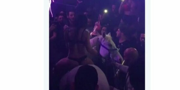 The marketing director at a Miama nightclub called the Makai Lounge had the bright idea to bring in a live horse on to the dance floor. There are multiple videos of a white horse being paraded into the nightclub with an employee on the back of the horse, at one point the horse stumbles and falls on the slippery floor.