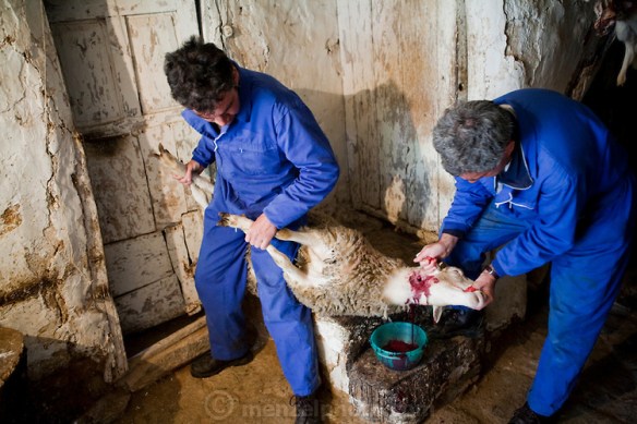 Miguel Angel Martinez Cerrada and his brother Paco slaughter a sheep for Easter at their family ranch in the tiny village of Zarzuela de Jadraque, Spain. (From the book What I Eat: Around the World in 80 Diets.) The sheep will be skinned, gutted, and hung in the cold house, and the meat will be eaten at Easter, when the extended family comes for dinner.