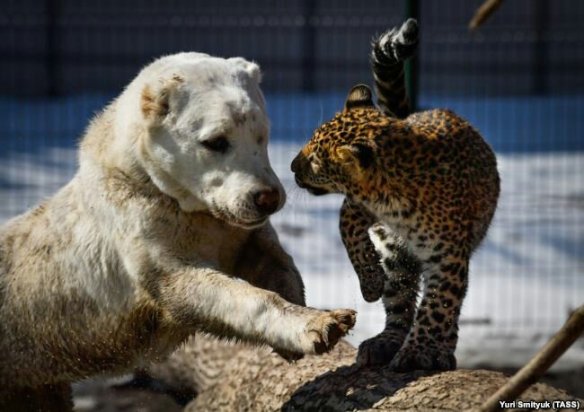 1 Elza (left), a Central Asian sheepdog, playing with Milasha, an African leopard cub.