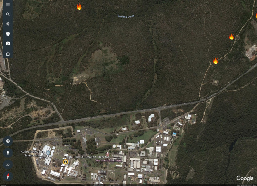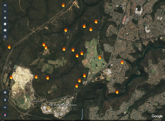 Fires as of April 16-17th. To give an idea of the map scale: Barden Ridge to Menai is approximately 3 km, meaning the fires are now very very close to the nuclear complex