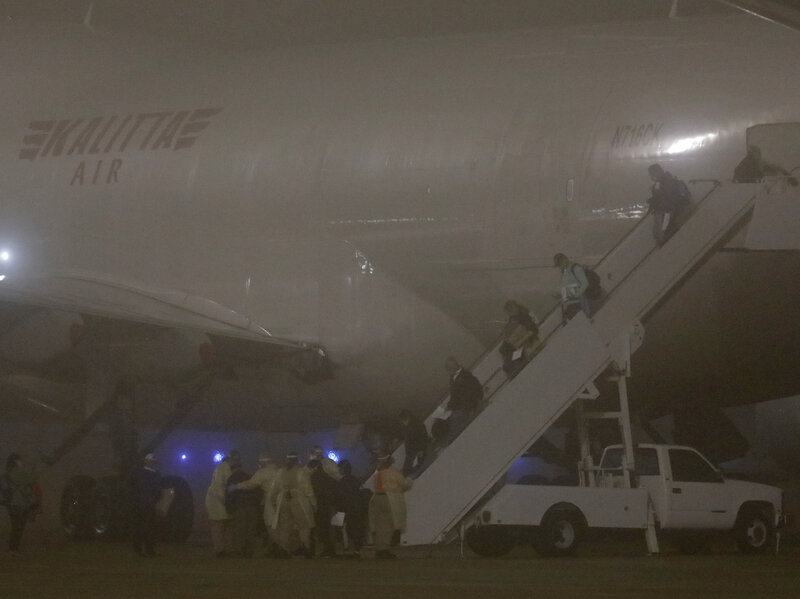American evacuees from the Diamond Princess cruise ship arrive at Joint Base San Antonio-Lackland on Monday in San Antonio, Texas.
