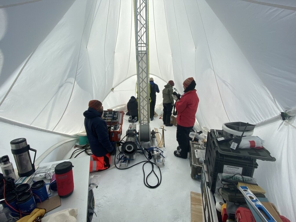 Inside of the Blue Ice Drill tent, drillers Tanner Kuhl (left) and Elizabeth Morton (right) work with graduate students Austin Carter, Jacob Morgan and postdoctoral fellow Sarah Shackleton in Antarctica in 2019.John Higgins