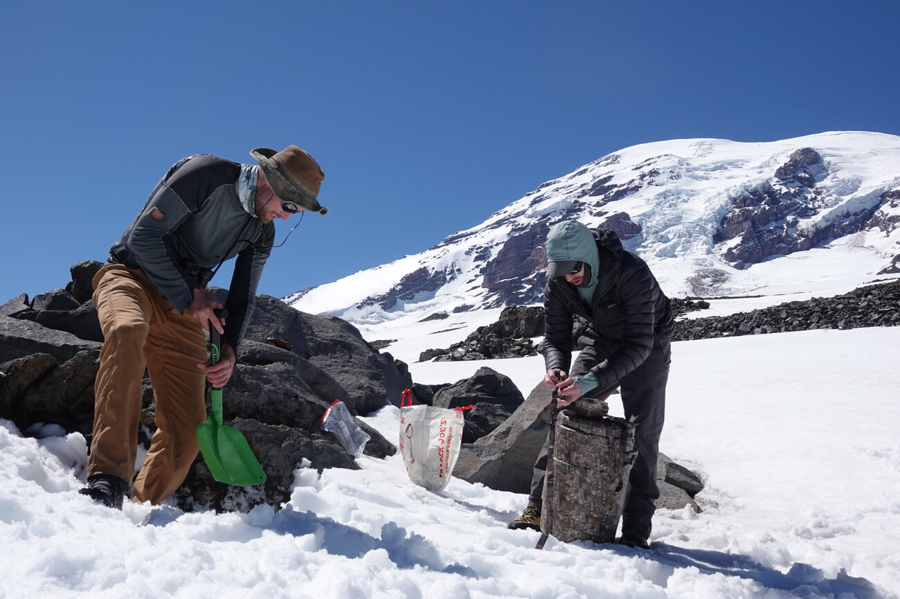 Ice worm researchers Scott Hotaling and Peter Wimberger led a trip to study life on the glaciers of Mount Rainier in June. For a long time, Hotaling says, biologists have written off high-altitude glaciers as sterile, lifeless places. But that’s no longer.Jordan Boersma