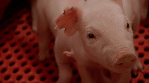 A piglet with notched ears which is a standard and permanent way that individuals at catalogued in the animal exploitation industry.