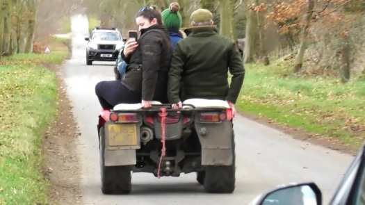 Supporters following the Dunston Harriers on an overloaded quad bike which is also illegally displaying an illegible registration plate. Police on the day took no action. Image South Norfolk Hunt Saboteurs