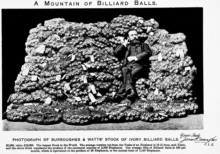 Amazingly, one tusk of an Asian elephant could only make 4–5 billiard balls, meaning that by the 19th century, the trade required almost industrial scale slaughter. One company alone, Burroughes and Watts (which still sells pool tables and accessories today, though of course not ivory) boasted in the 19th century that it sold 1,140 elephants’ worth of billiard balls each year.