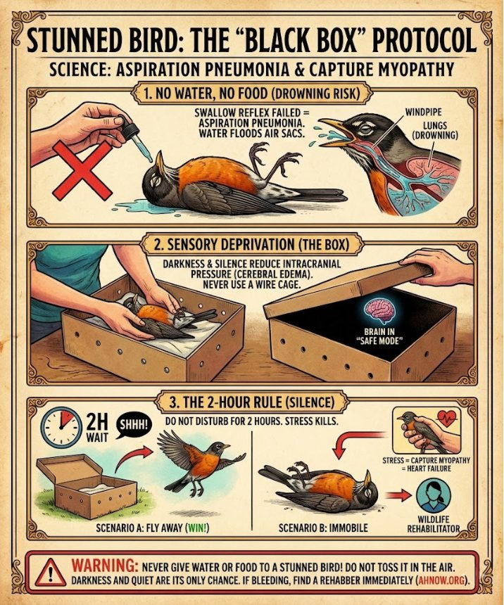 If you find a stunned bird time is everything. Be very gentle but swift. It’s best to take any stunned or injured bird immediately to a rehab. If you are not near one this is the next best thing to do.