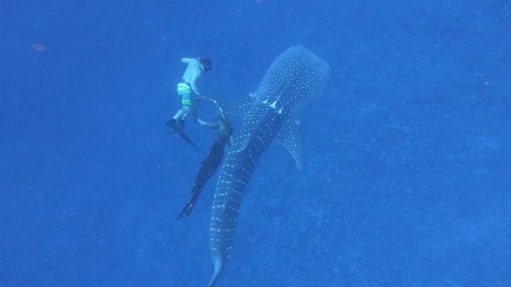 Whale sharks typically swim away when they’re touched, says Norman, so the fact that the shark remained even after Rohrer began to saw at the rope is evidence that it was comfortable with the situation. Norman calls it “amazing to see.”