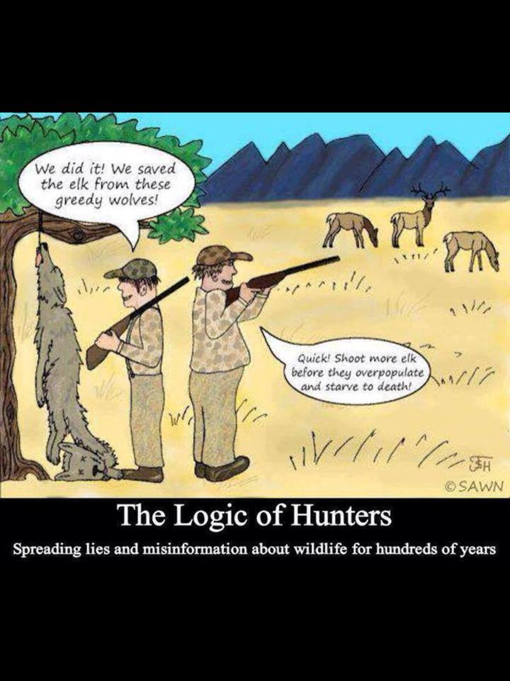 Hunters are not conservationists, they have absolutely no respect for other species, nor the environment. And if a stray bullet enters your home during “hunting season”, you can expect your fears and outrage to be ignored by the hunting community at large in the same manner that they ignore property rights and the sentience of every life on the planet for that next trophy kill, that next fix for their insatiable blood lust addiction, the need for that next wolf which they can murder in order to proclaim themselves as masters of the universe.