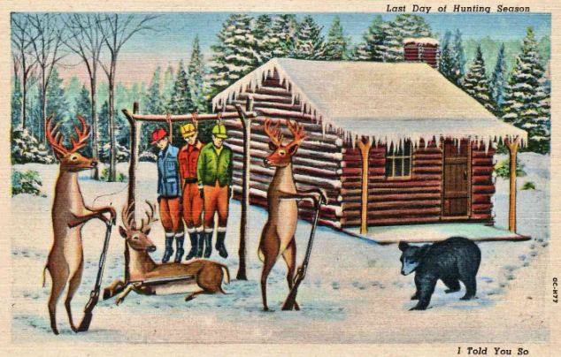 Suddenly you’re enlightened and, like the Grinch, your tiny heart grows three sizes that day. The war is over and you realize that the animals were never the enemy after all. You spring up from the sofa, march over to the gun cabinet and grab your rifles, shotguns, traps, bows and arrows. Hauling the whole cache out to the chopping block, you smash the armaments to bits with your splitting maul. Next, you gather up your ammo, orange vest and camouflage outfits and dump ‘em down the outhouse hole.